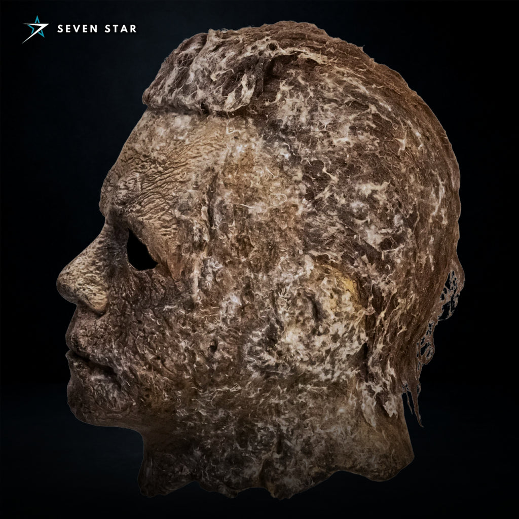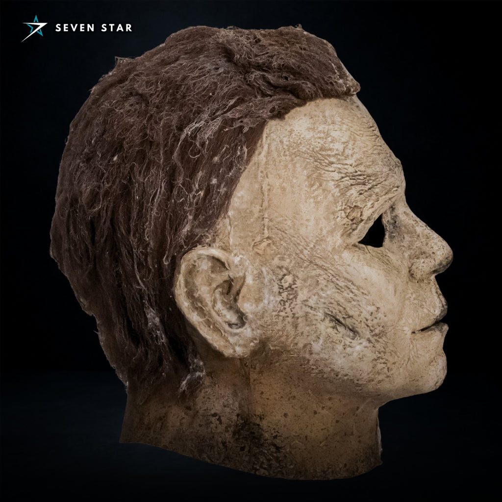 Replica fiel do master do filme: Cada detalhe é esculpido para reproduzir o rosto decrépito de Myers após anos de batalha.